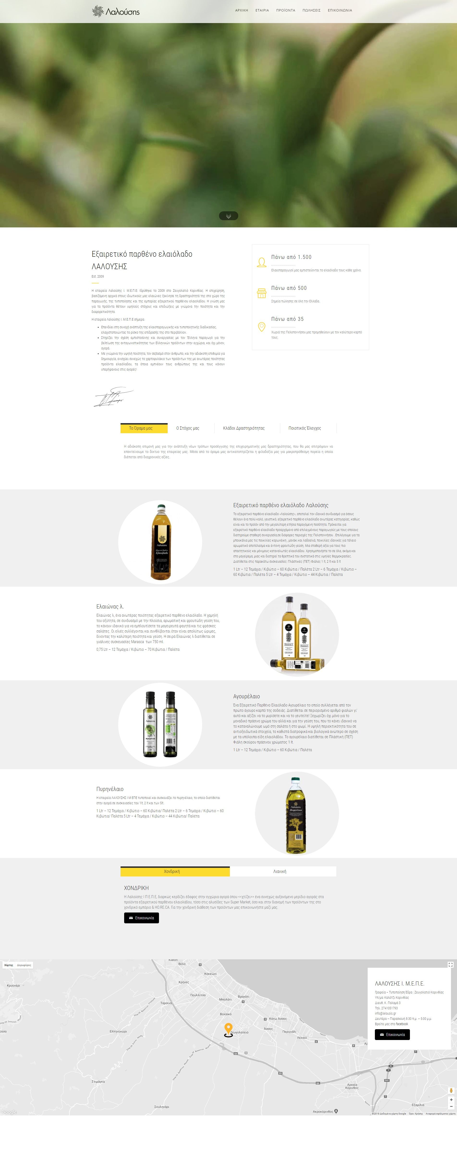 Lalousis company’s website has all the characteristics of a proper corporate page. A brief description of the operation and a detailed presentation of its products summarize the identity of the company, fully dressed with realistic pictures of the facilities, the production site and its products. Meaningfulness, easy access and functionality are the main features of its website and therefore its corporate character.