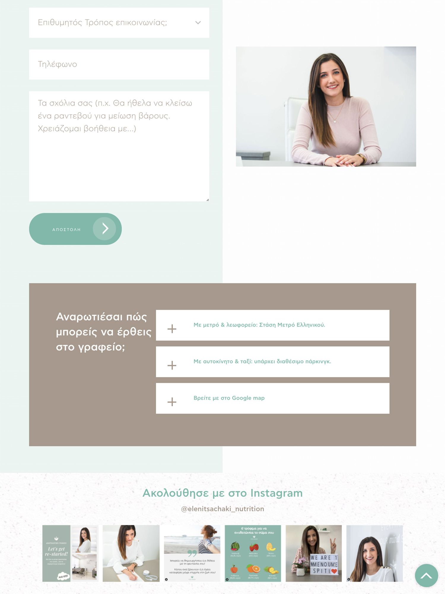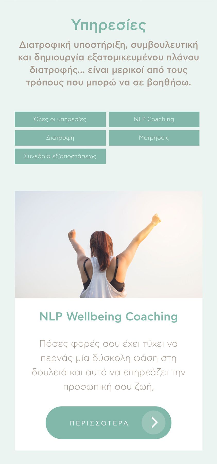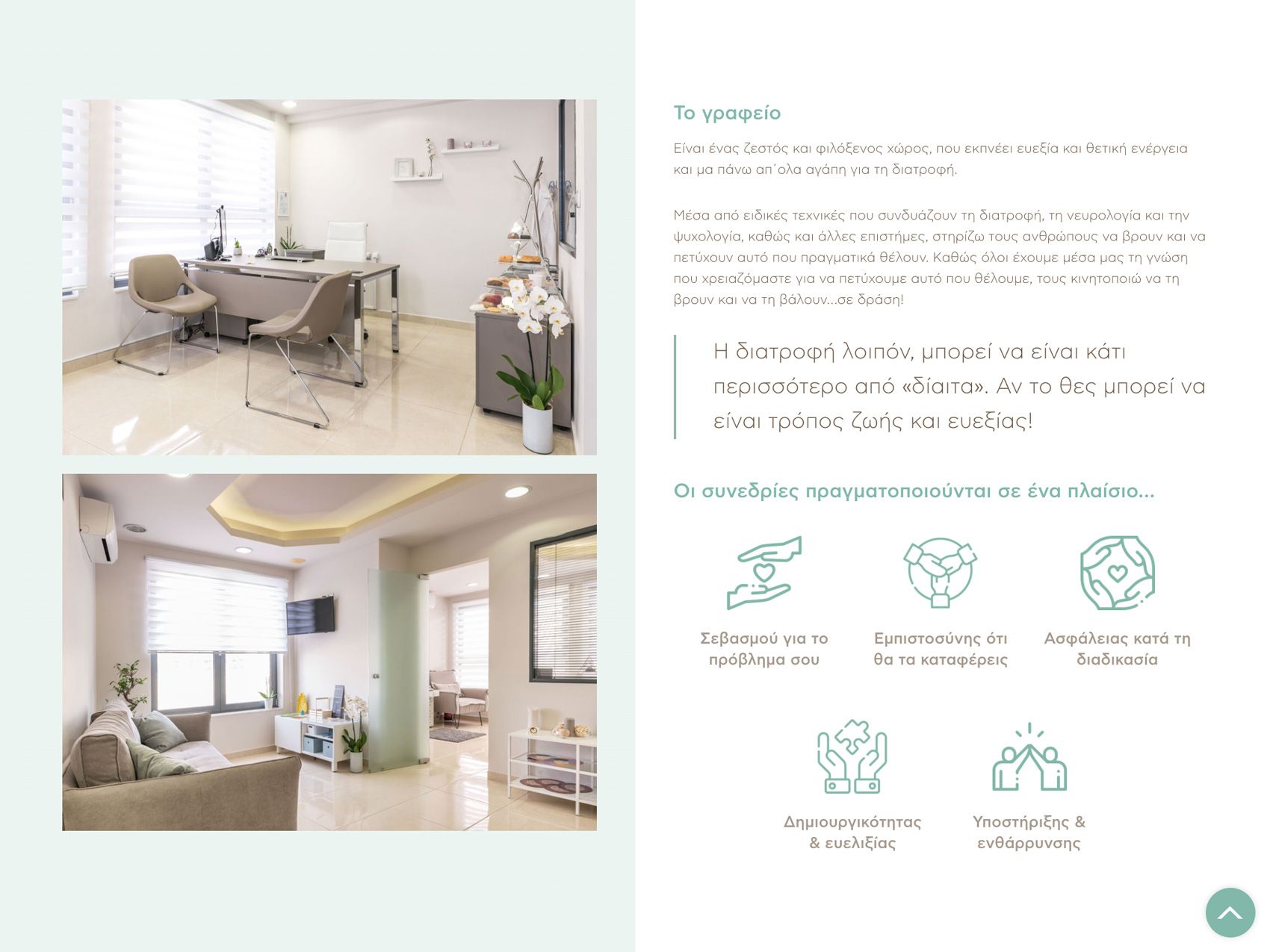 We chose to present the categories of services provided separately, laying emphasis on the beliefs and special knowledge of the dietitian-nutritionist. We wanted the aesthetic outcome to be fully harmonized with the branding of the office. For this purpose and in combination with the minimal design, we chose pastel shades, on a white background, which enhance the feeling of tranquility and harmony.