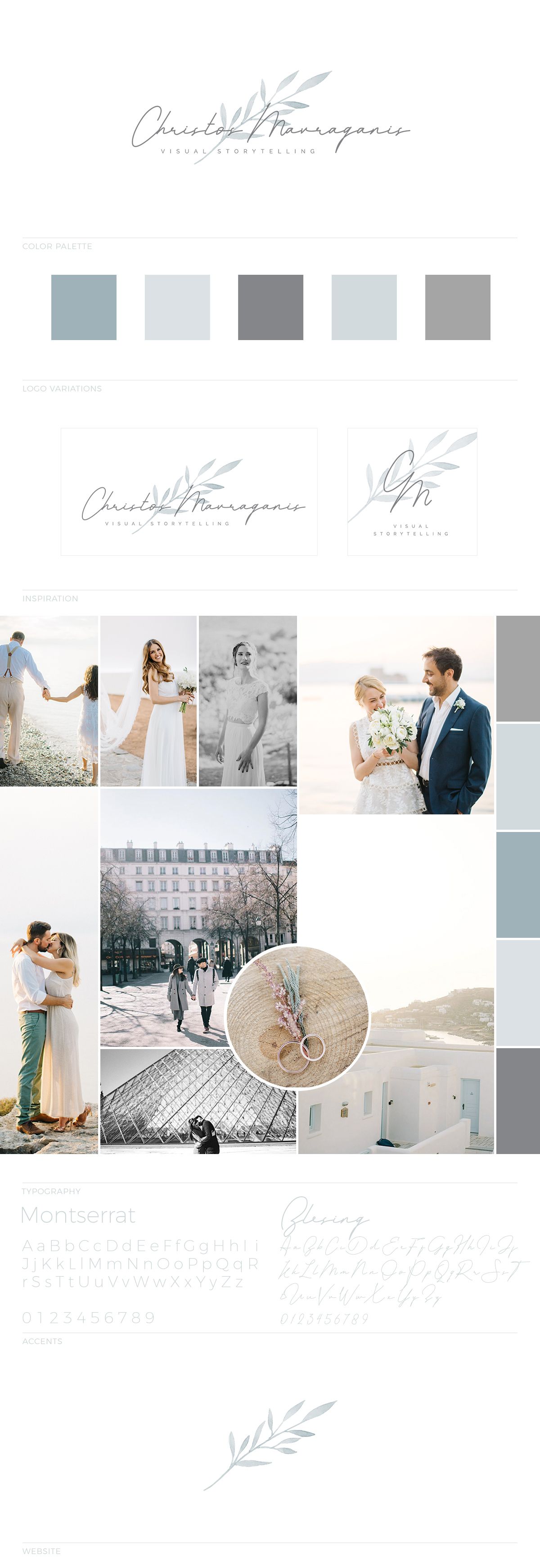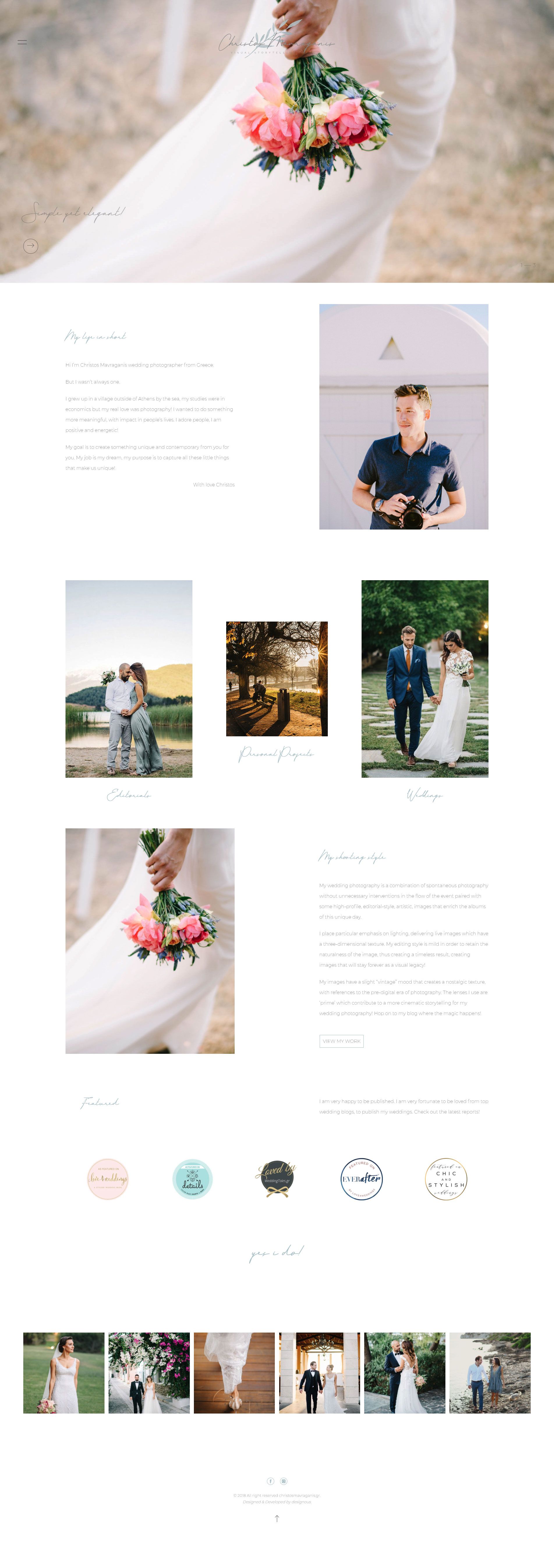 Αυτά ήταν τα συναισθήματα που θέλαμε να μεταφέρουμε στον επισκέπτη του site christosmavraganis.gr. Σε αυτό συνετέλεσε αποτελεσματικά και το rebranding που πραγματοποιήθηκε ταυτόχρονα με τη δημιουργία του website. Το λογότυπο επιμελήθηκε έτσι ώστε να ενσωματωθεί αρμονικά στο ύφος της νέας ιστοσελίδας. Τόσο σε αυτό, όσο και στο site, χρησιμοποιήθηκαν απαλά pastel χρώματα, απλές και λιτές λεπτομέρειες chic γραμματοσειρές και minimal πινελιές. Τα στοιχεία αυτά σε συνδυασμό με το άσπρο καθαρό φόντο, που παρουσιάζει την δουλειά του φωτογράφου με ευκρίνεια, συνωμοτούν στο να καλλιεργήσουν στον επισκέπτη το αίσθημα της πραότητας, της ηρεμίας και της γαλήνης. Η γραμματοσειρά που χρησιμοποιήθηκε στο λογότυπο απεικονίζει την ίδια την υπογραφή του φωτογράφου, σαν ένδειξη προσωπικής σφραγίδας για κάθε φωτογραφικό project που παραδίδει ενώ για το site χρησιμοποιήθηκαν κομψά και elegant μοτίβα.